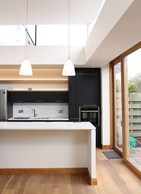 The brief was to make a space more suited to entertaining guests, with improved accessibility across the ground floor. The site is predominantly north facing so in order to create a bright, welcoming space, the design is based around a large, clerestory glazed rooflight. This allows a high level of ambient light throughout the day and sunlight to stream in from the West in the late afternoon and evening. It also ensures the existing back rooms are not adversely overshadowed.